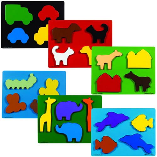 18 months & up. The thick, chunky wooden puzzle pieces fit neatly into their spots on the colorful board and also stand up for additional pretend play. Set of 6 puzzles, each containing 4 pieces.